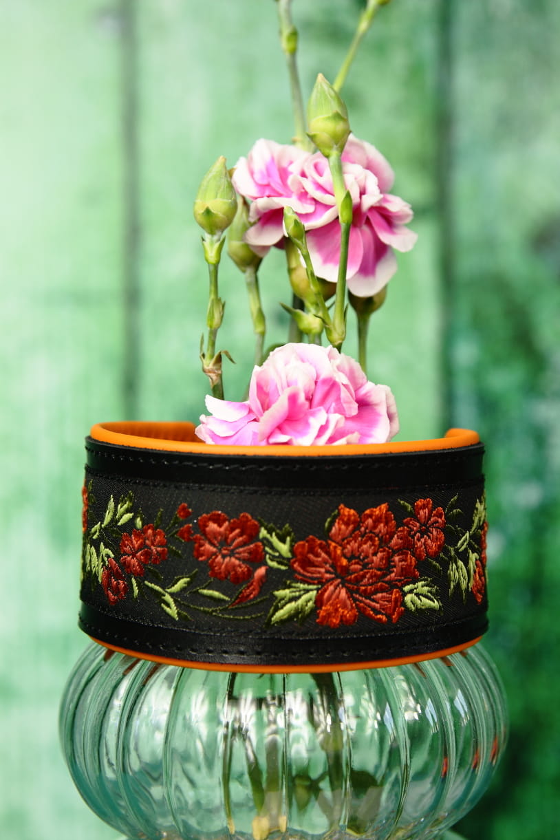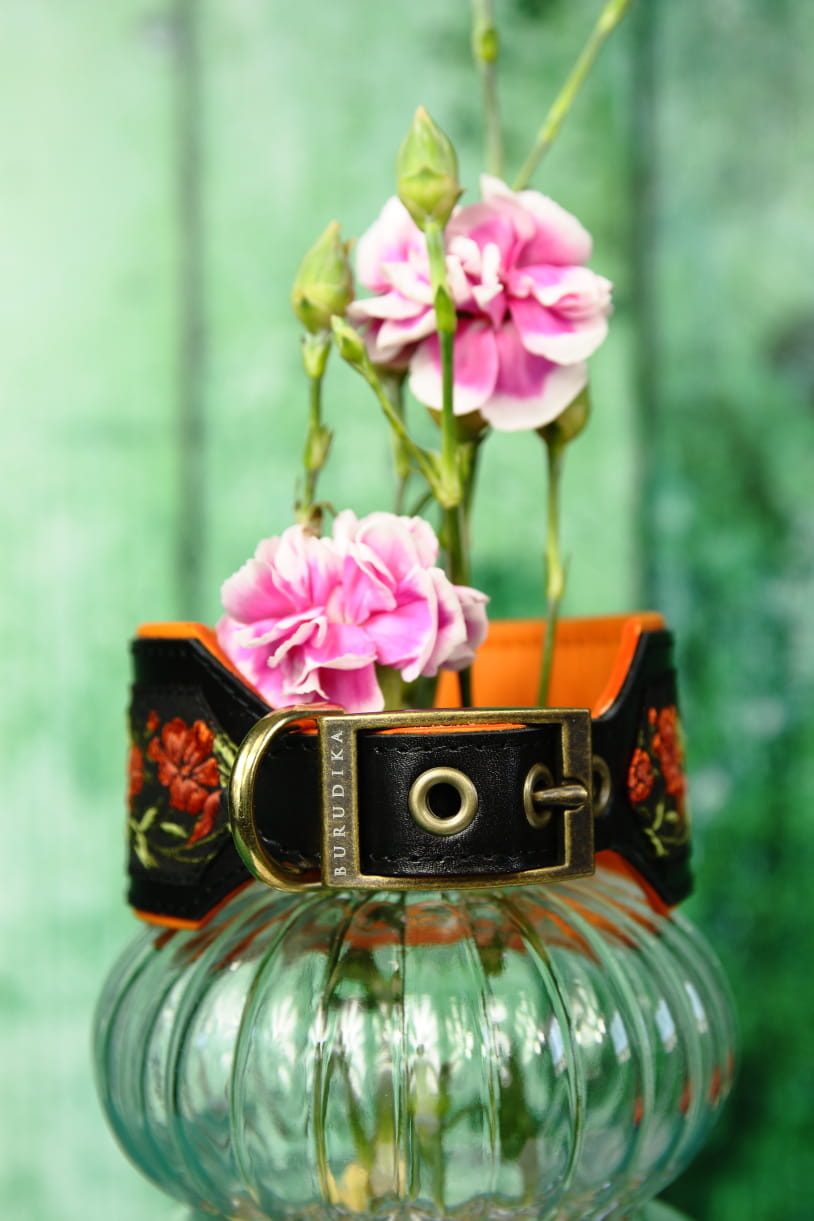 Skórzana obroża w kolorze czarnym z tkaną taśmą z motywem pomarańczowych kwiatów. W słońcu przepięknie mieni się w trójwymiarze. Pomarańczowe energetyzujące podszycie. Klamerka w kolorze starego złota. Subtelny grawer z logo.
