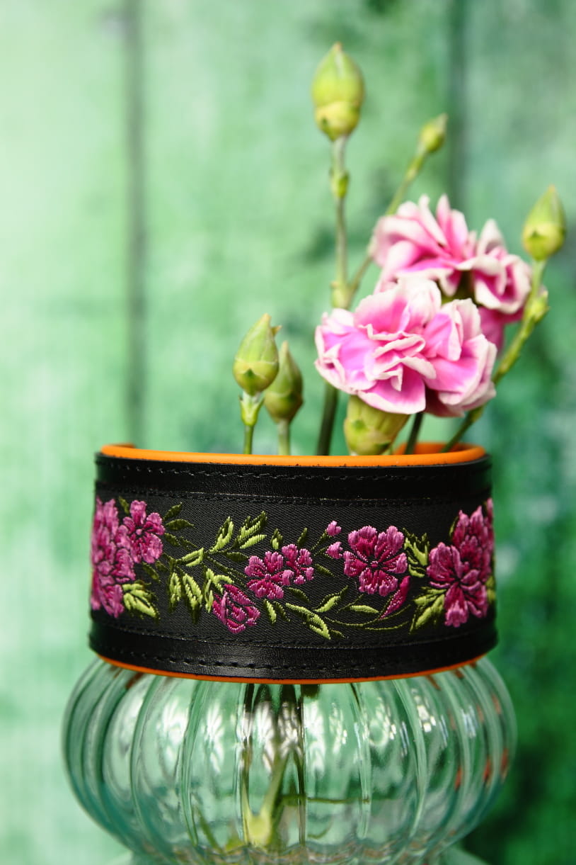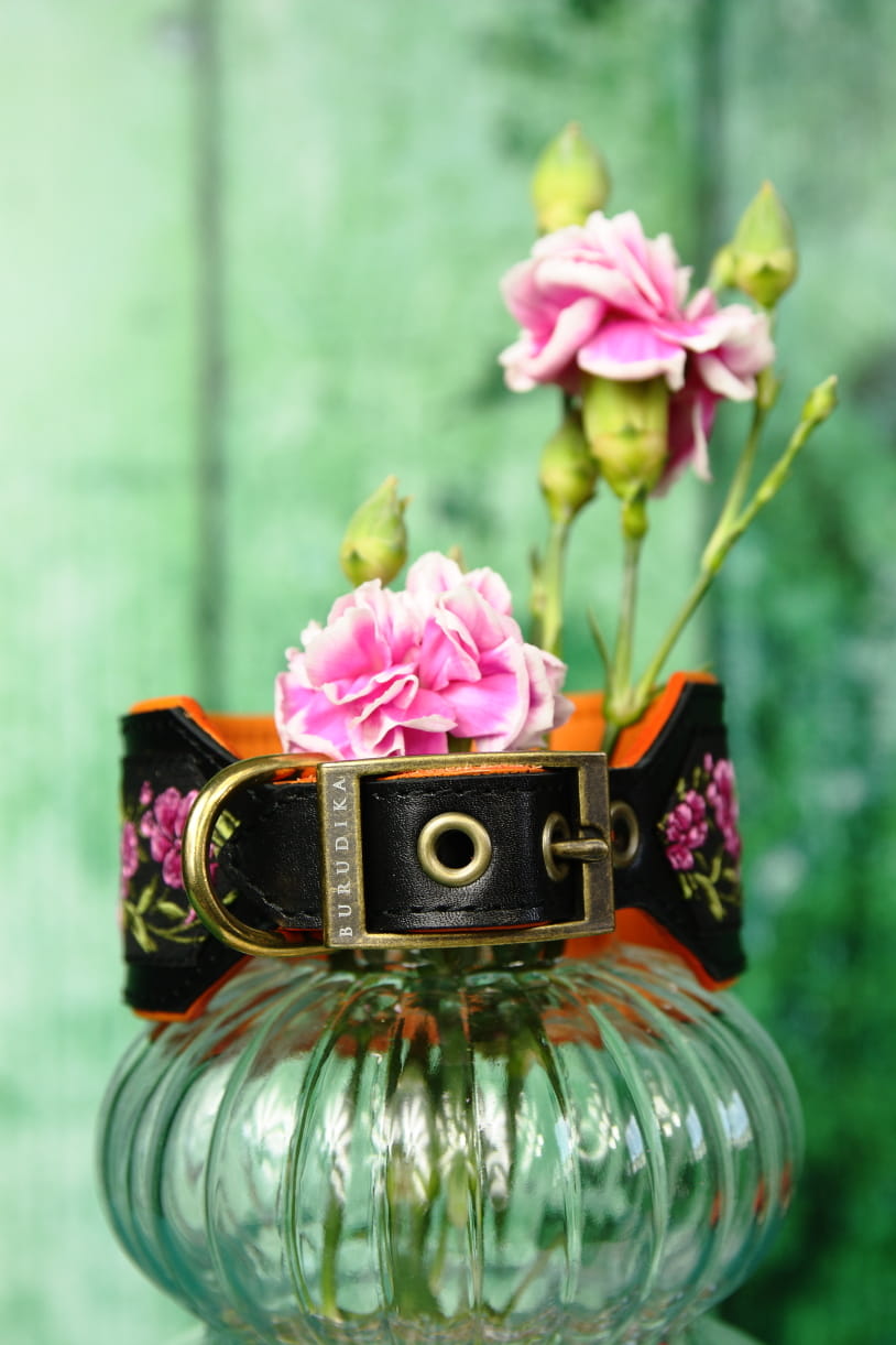 Skórzana obroża w kolorze czarnym z tkaną taśmą z motywem różowych kwiatów. W słońcu przepięknie mieni się w trójwymiarze. Pomarańczowe energetyzujące podszycie. Klamerka w kolorze starego złota. Subtelny grawer z logo.