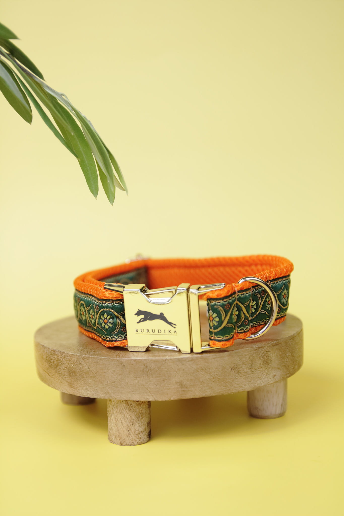 Materiałowa obroża z kwiatowym motywem z przewagą soczystej zieleni. Klamerka w kolorze złota. Grawer z logo.